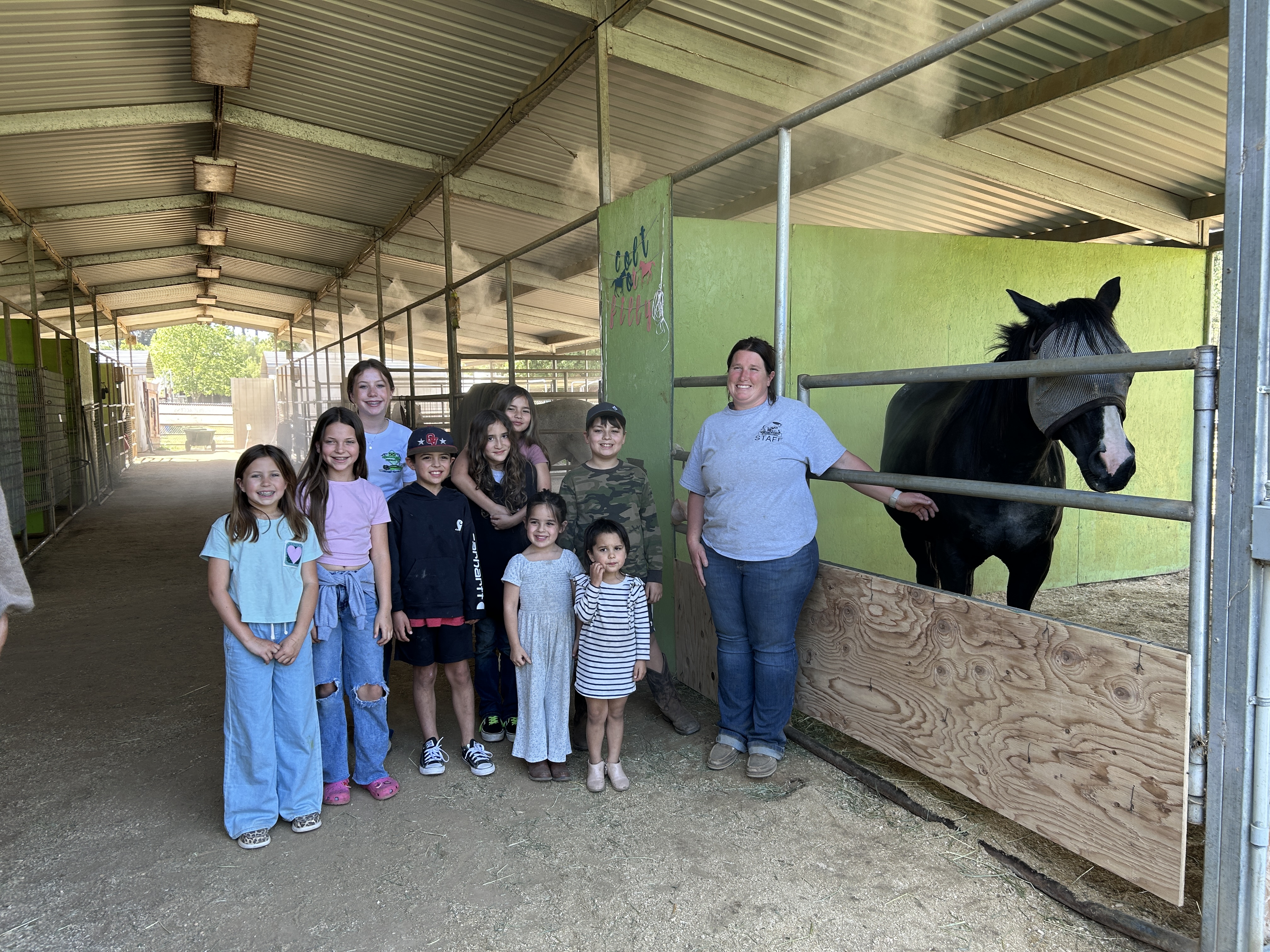 The visit didn’t stop there. After spending time in the kennels and cat rooms, the students made their way down to the barn to meet our equine residents and learn more about our horse rescue program. Equine Manager Christina Malleck welcomed the students and introduced them to Jasmine, a beautiful rescue horse who was pregnant at the time of their visit. Christina shared insights about horse care, rescue, and the important work HSVC does to rehabilitate and rehome equines.