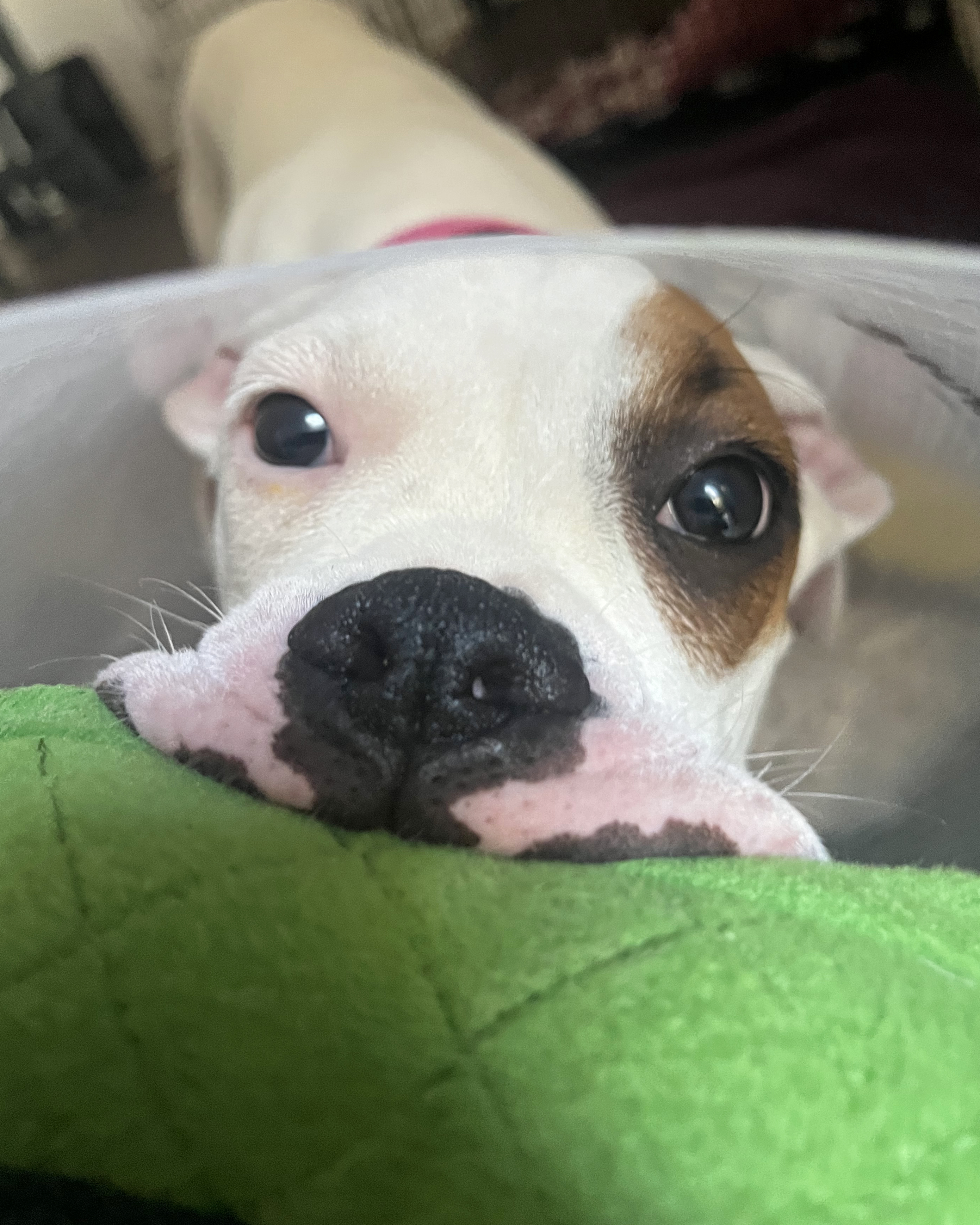 In addition to her injury, staff believe Bullseye may be deaf or hard of hearing. However, don’t let her setbacks fool you! The young pup is already picking up on visual cues and is eager to learn from those around her. She's smart, determined, and full of love despite the rough start she’s had. Bullseye is potty trained, working on crate training, and has been around small dogs. Like many puppies, she struggles when left alone and needs a patient foster who can help her feel confident and secure in her environment.