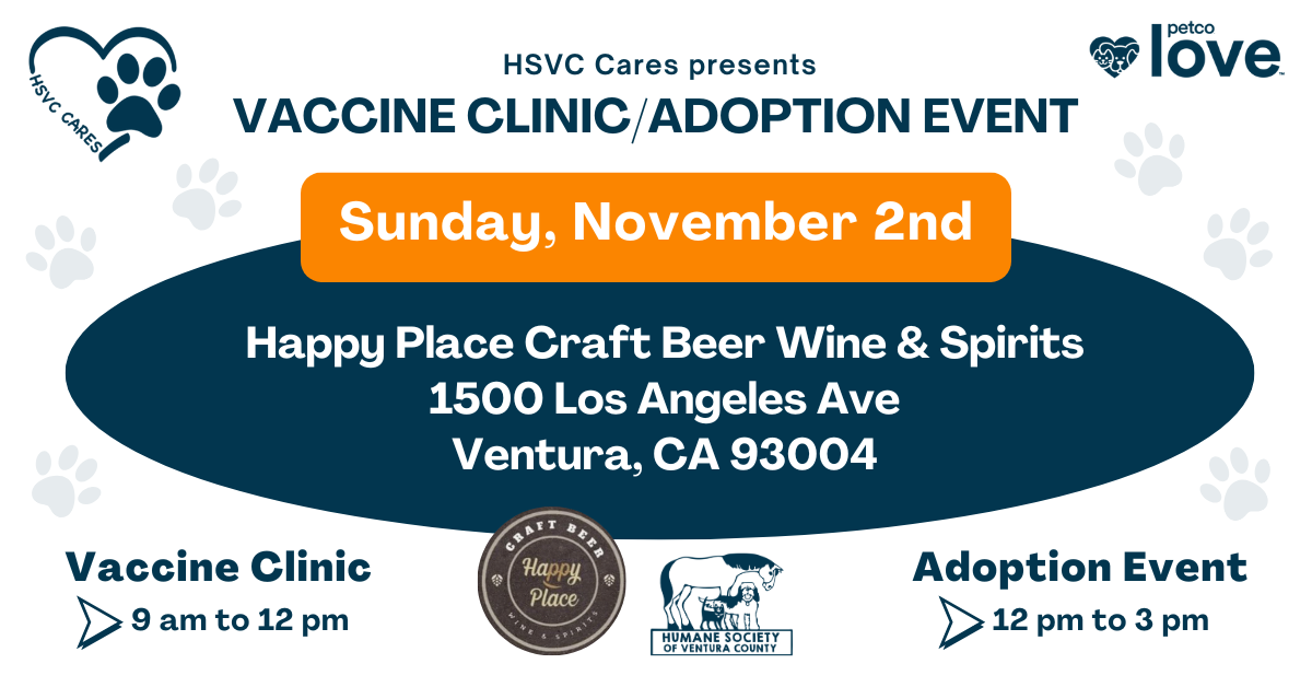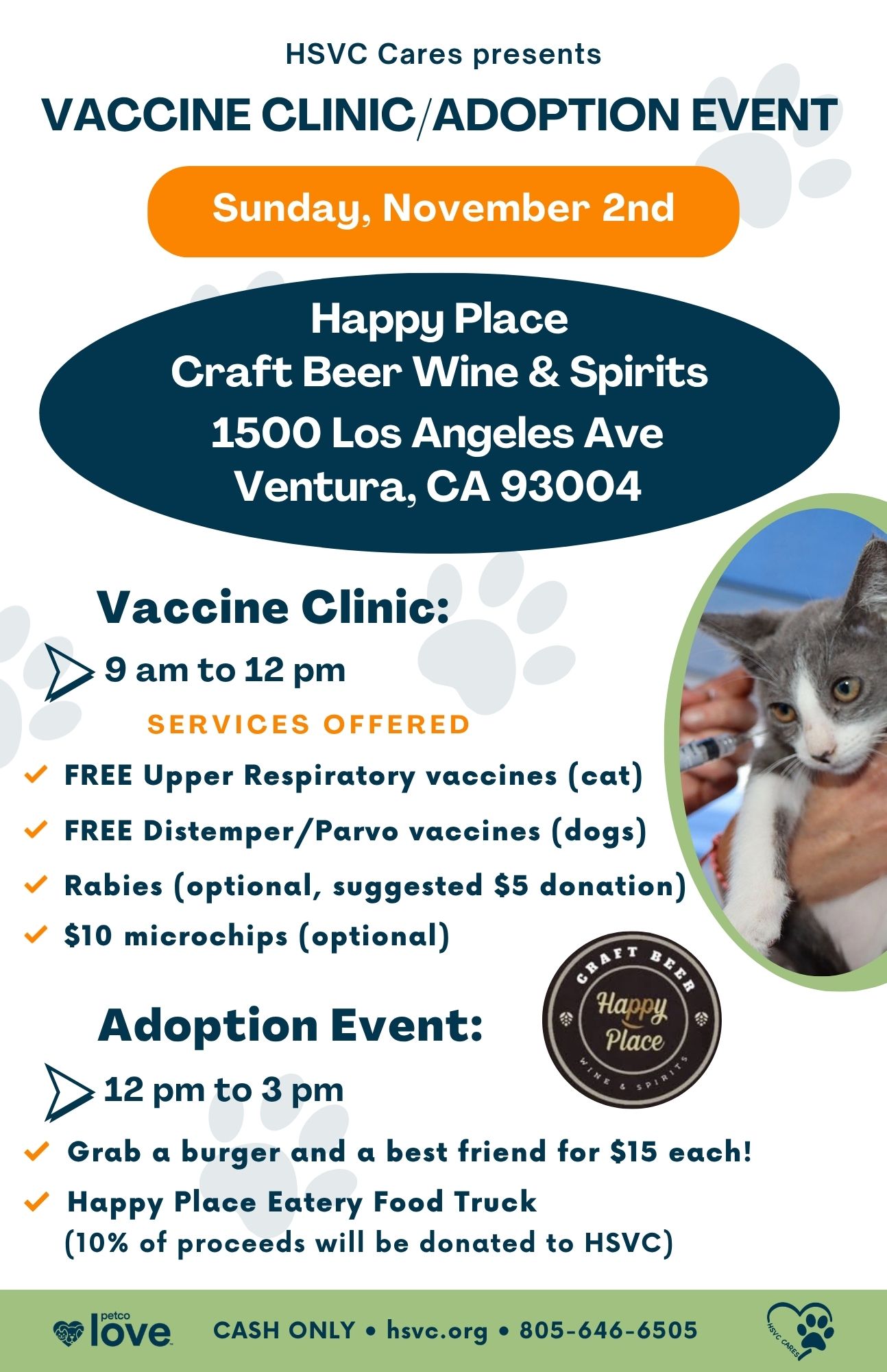 HSVC Cares is hosting another low-cost vaccine clinic for your furry friends! Join us Sunday, November 2nd, from 9 am to 12 pm at the Happy Place Craft Beer Wine & Spirits in Ventura (1500 Los Angeles Ave) for a FREE vaccination clinic. No appointment necessary. First-come, first-served while supplies last! CASH ONLY.