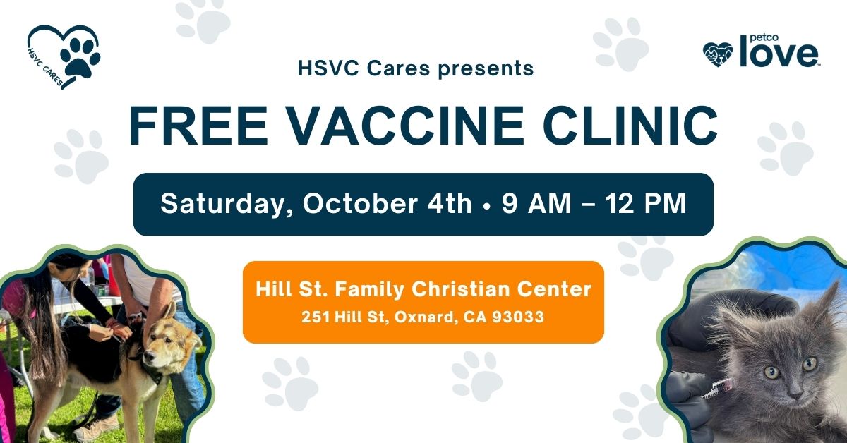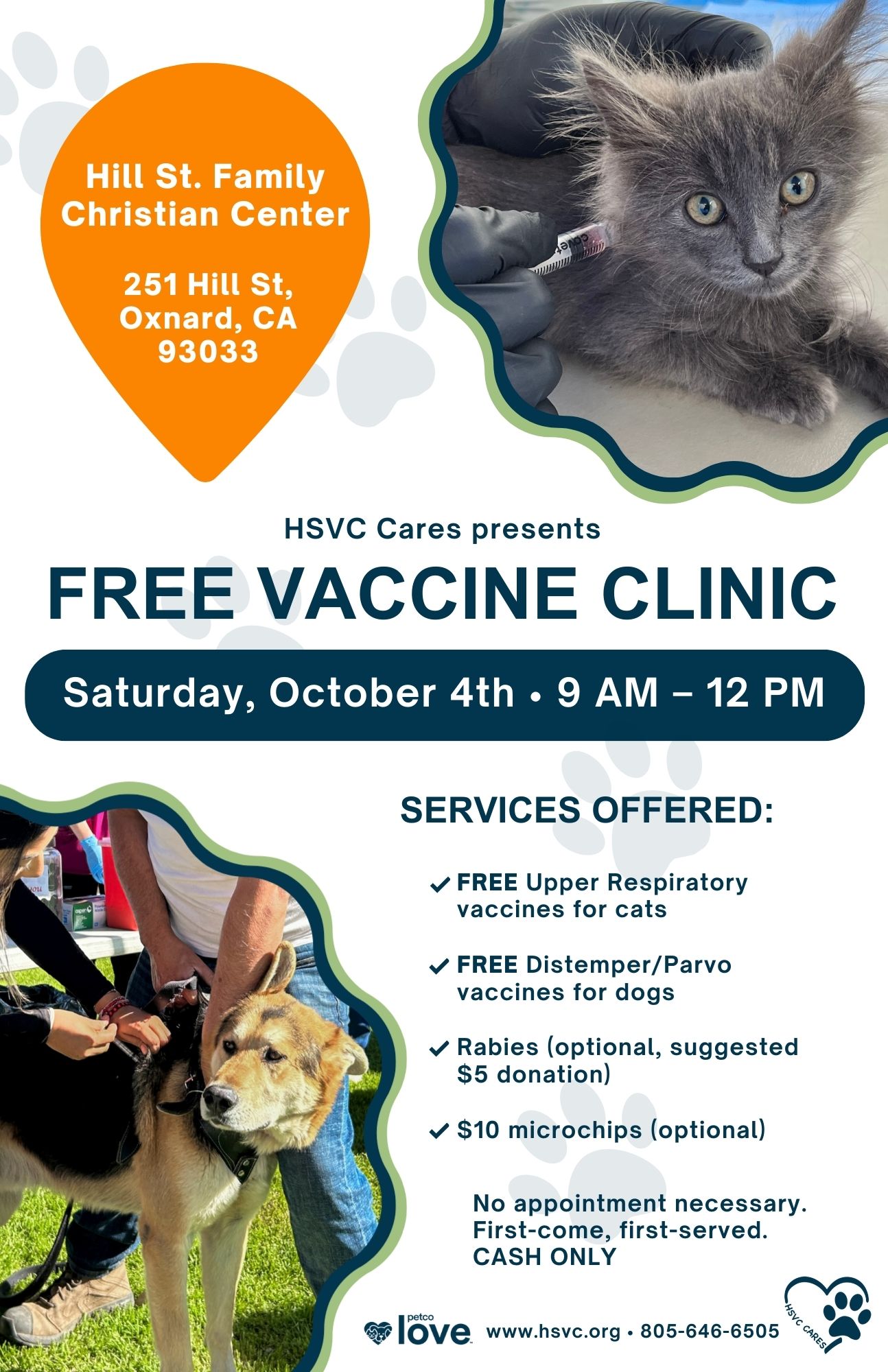 HSVC Cares is hosting another low-cost vaccine clinic for your furry friends! Join us Saturday, October 4th, from 9 am to 12 pm at the Hill St Family Christian Center (251 Hill St.) in Oxnard for a FREE vaccination clinic. No appointment necessary. First-come, first-served while supplies last! CASH ONLY.
