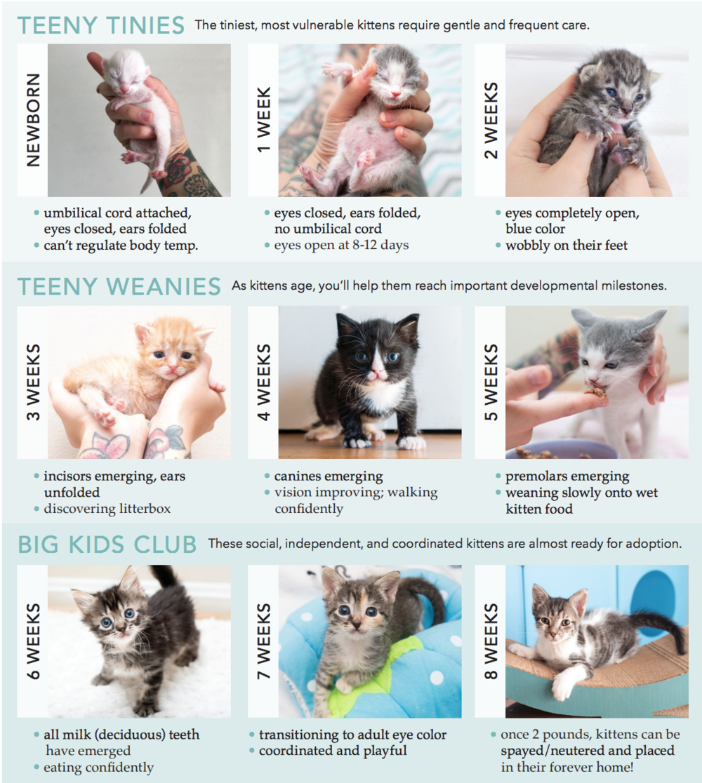If you’re unsure, you can use this kitten age guide (left) from the Kitten Lady or call us at the HSVC. We’re always happy to help determine the best next steps for their care. Weighing the kittens in grams, if possible, can be a helpful way to estimate their age if unknown. Taking photos of the kittens on the scale alongside their weight can also be very useful for keeping accurate records.