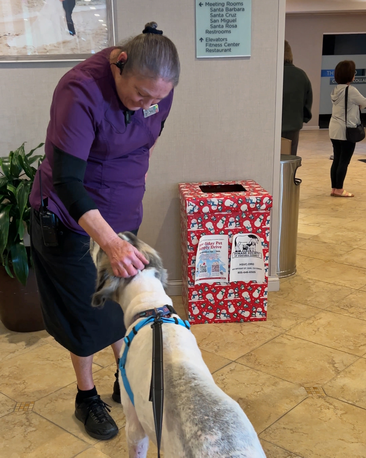 Above: Shelter pup Doja picking out a new toy (left), HSVC alumni Zuko dropping off donations (left center), and shelter pup Yeti thanking a member of staff at the Crowne Plaza Hotel (right center)